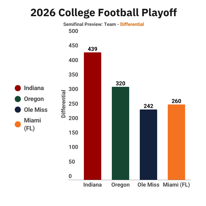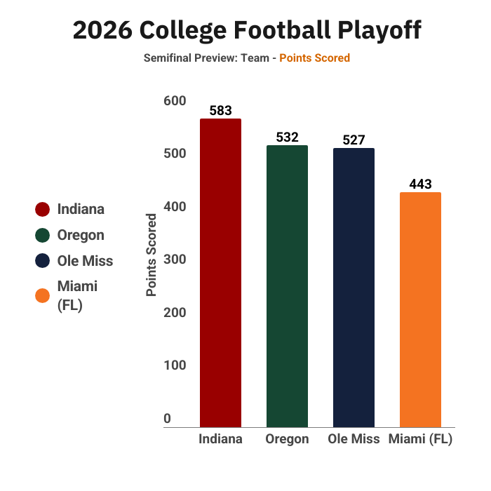 Ole Miss accounted for an outsized 35% of points allowed by the 2026 CFP Semifinalists. Opponents tallied up 285 yards against Ole Miss, compared with 144 points for Indiana. Miami (FL) and Oregon were in the middle.