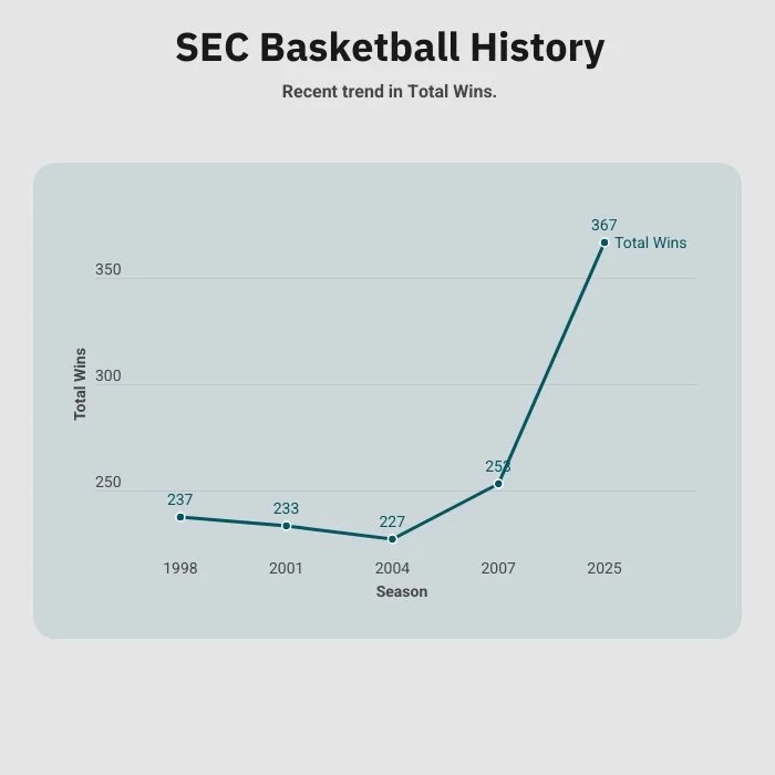 The 2025 basketball season was statistically the SEC’s best showing in modern history. As a group, the 16 teams went 367-195 (.653). The next strongest season was 2007, when the conference’s 12 teams finished out 253-153 (.623). Some runner ups for strongest season: