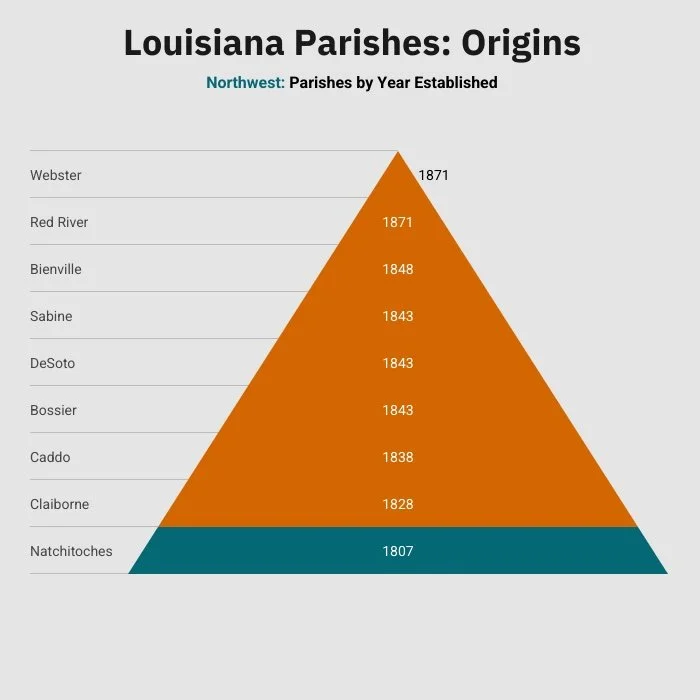 Claiborne parish was established in 1828, created from a piece of Natchitoches parish. Then came Caddo in 1838, also from a piece of Natchitoches parish.