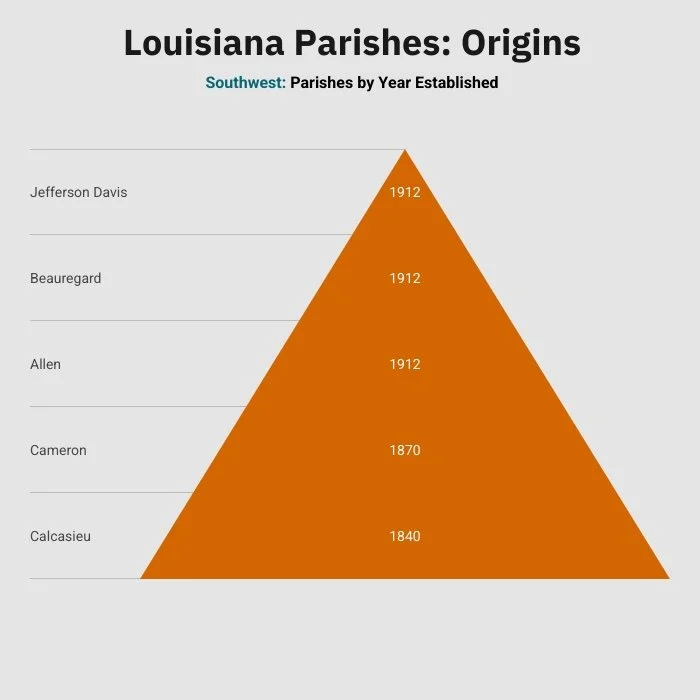 Calcasieu was the first to be created in 1840 and comprised of parts of St. Landry parish (Acadiana).