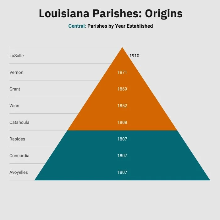 Three of the eight current parishes in Central Louisiana were a part of the state’s original 19 jurisdictions. Those original parishes were Avoyelles, Concordia and Rapides. Catahoula parish was established in 1808, from parts of Ouachita (Northeast) and Rapides.